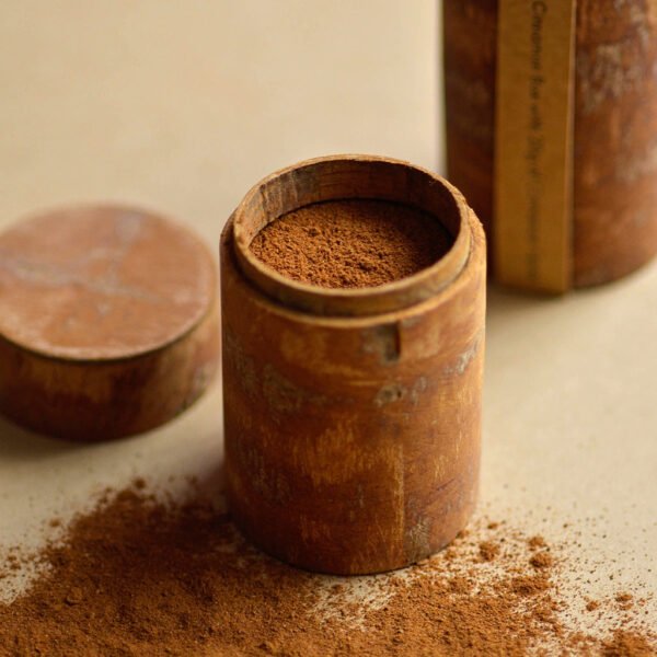 The set includes a mini container made entirely from naturally fragrant cinnamon bark, alongside 20g of premium, powdered Saigon cinnamon spice.