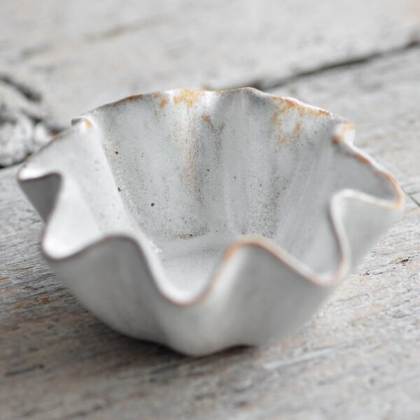 This mini ceramic bowl in snow white is a true organic piece of pottery, with ruffled, wavy edges inspired by traditional brioche pans. Each tiny bowl is hand-formed, giving it an irregular shape that ensures no two are exactly alike. Finished with a smooth white glaze, this small bowl is perfect for serving condiments, small snacks, or dips. Its artisanal design adds a touch of elegance to any table setting, making it a must-have for those who love unique, handmade ceramic tableware.