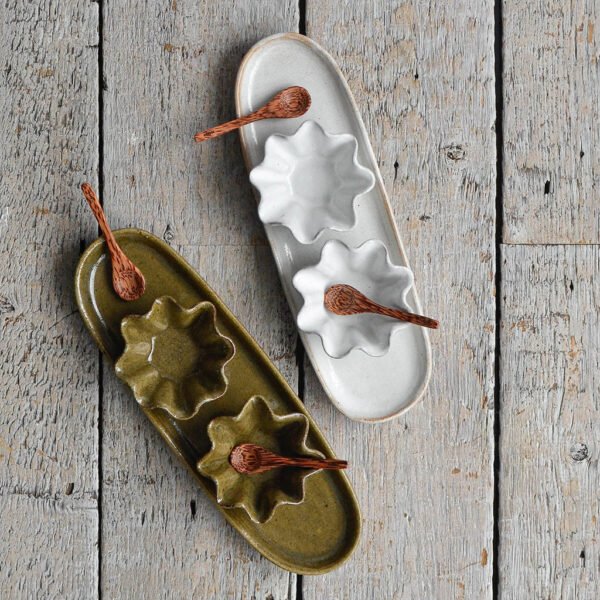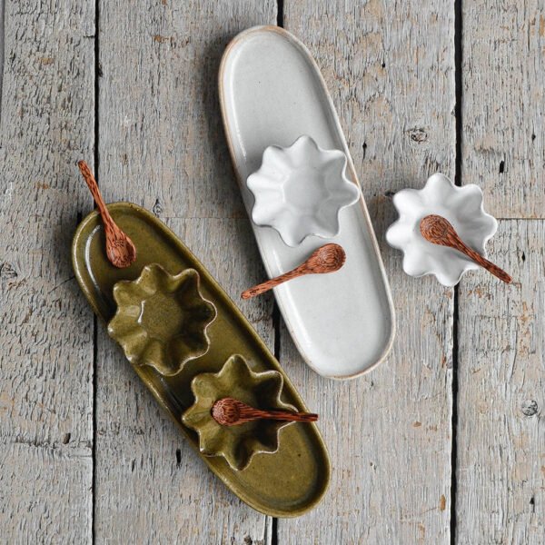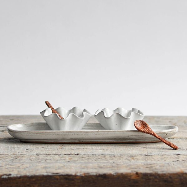 A truly unique serving set, featuring two condiment bowls with an intricately hand crafted ruffled design, a narrow tray and two coconut palm mini spoons. Finished in a classic snow-white glaze, this set can be used to serve condiments such as salt and pepper to the table, or for dips, sauces or small nibbles. The perfect serving accessories to elevate a table setting.