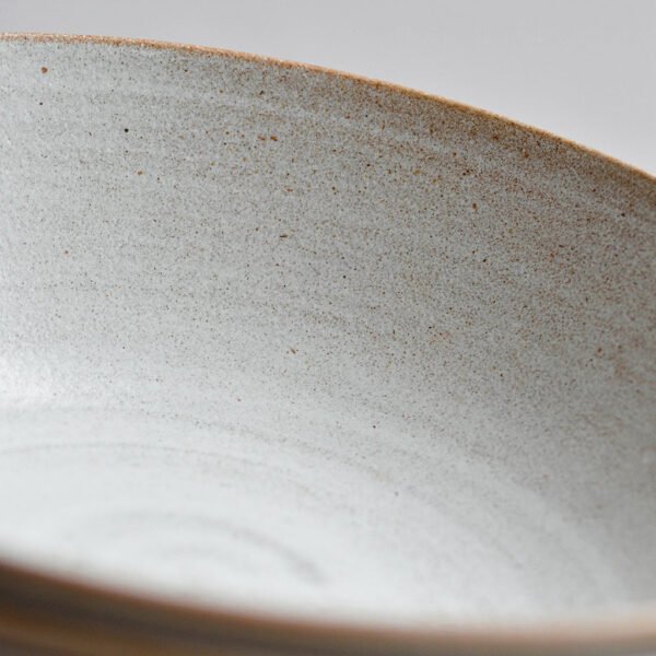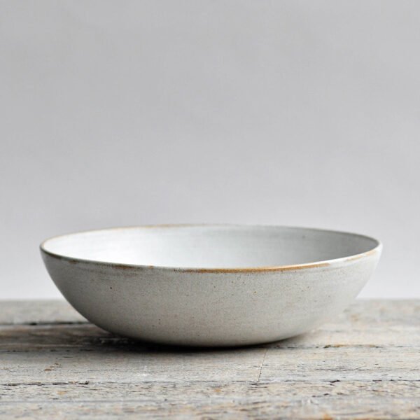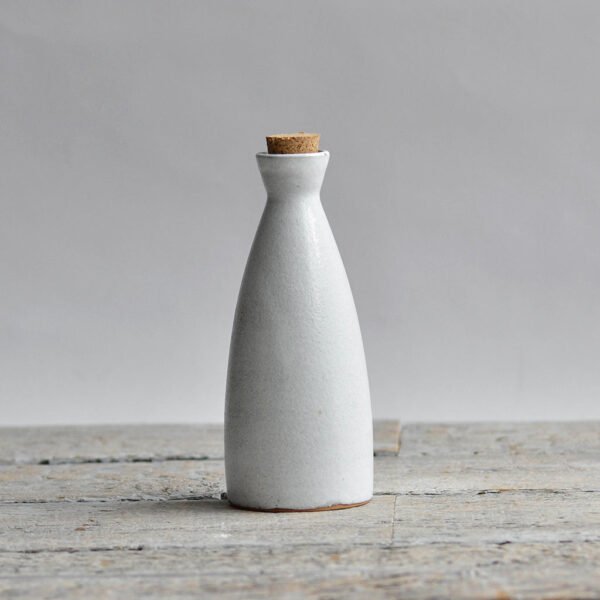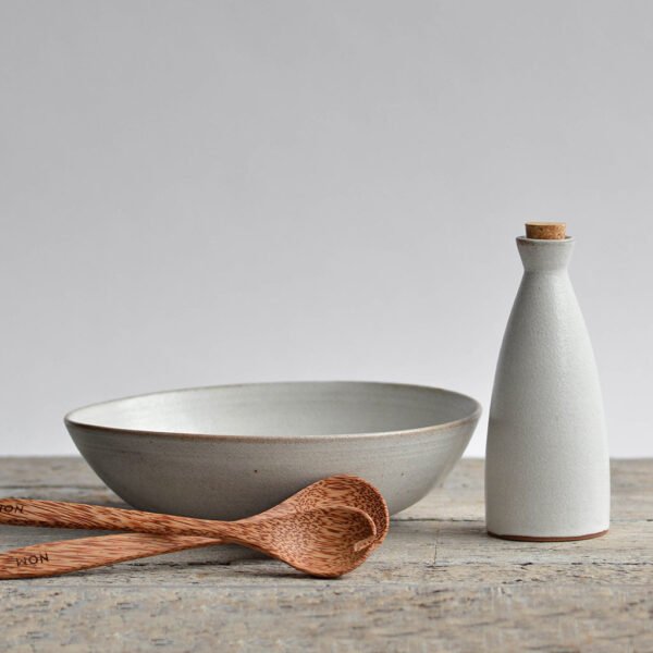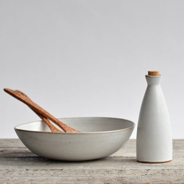 A stunning, rustic salad serving set, featuring a wheel-thrown serving bowl, a small bottle for oil or dressing, and a pair of coconut palm salad servers. Full of artisan charm, this is the ideal set for smaller salads, pasta or other sharing dishes. Finished in our classic semi matt snow-white glaze, with hints of clay tone.